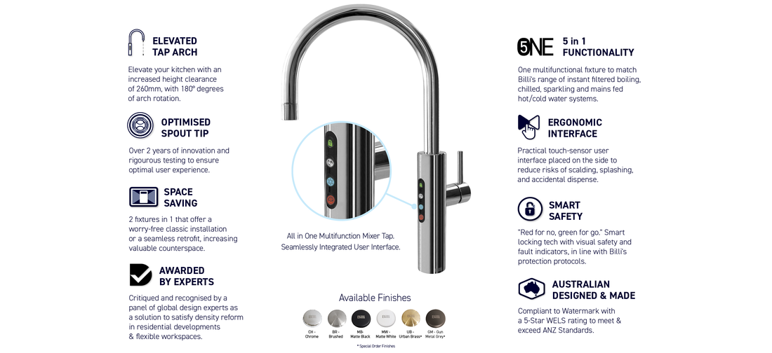 Originating in Australia, Billi has been at the forefront of the instant filtered boiling, chilled & sparkling water systems industry for over 35 years. Billi products are celebrated for their combination of functionality, performance and contemporary aesthetics.